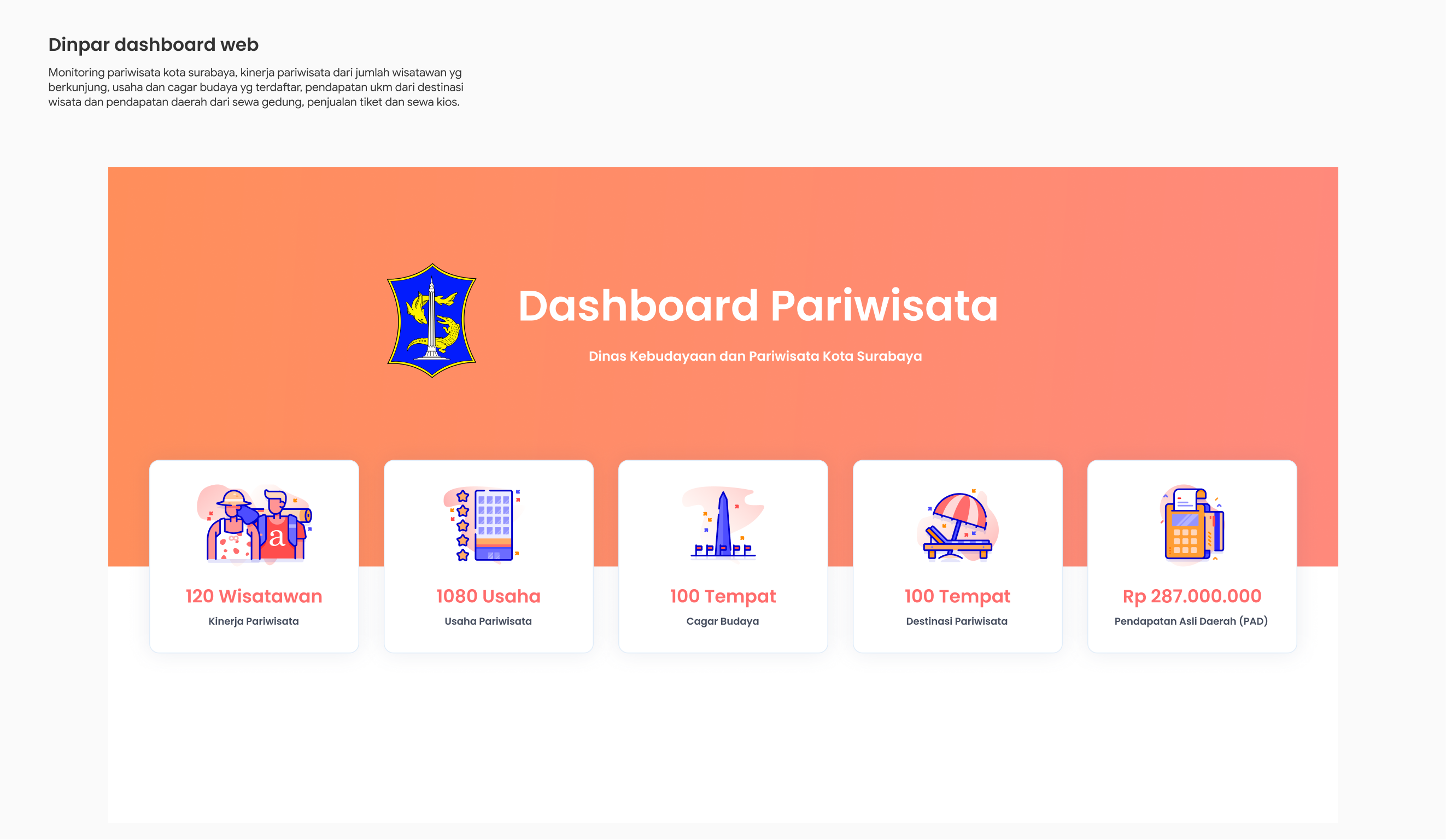 Dinas Pariwisata dashboard Web merupakan aplikasi berbasis web yang digunakan untuk Monitoring pariwisata kota surabaya, kinerja pariwisata dari jumlah wisatawan yg berkunjung, usaha dan cagar budaya yg terdaftar, pendapatan ukm dari destinasi wisata dan pendapatan daerah dari sewa gedung, penjualan tiket dan sewa kios.